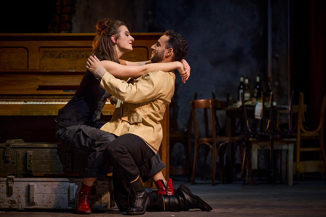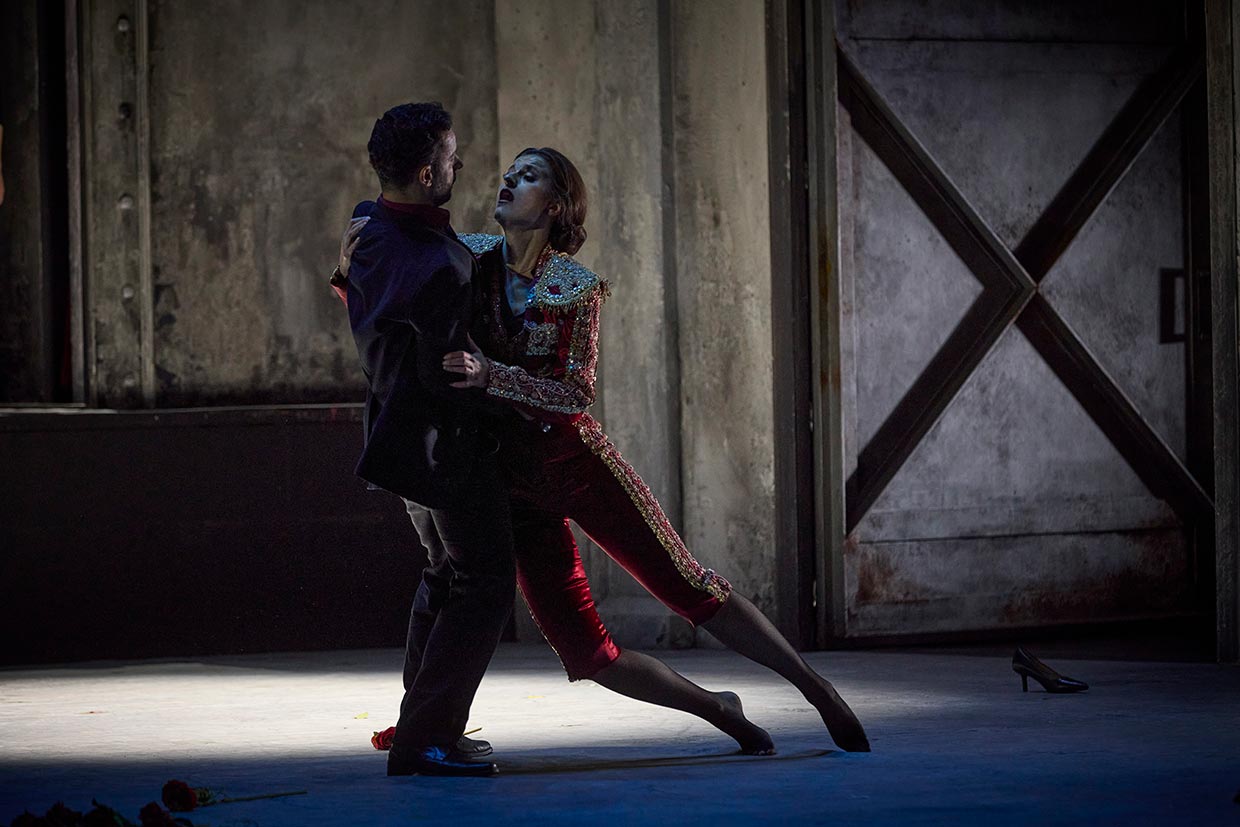 Carmen ist eine Ideologin der Freiheit. Die schöne Arbeiterin in der Zigarettenfabrik möchte lieben, aber von niemandem besessen werden. Als der Soldat Don José sich in sie verliebt, gerät er in einen unauflöslichen Konflikt zwischen seinen bürgerlichen Vorstellungen von einer Beziehung und Carmens Sehnsucht nach dem „Là-bas“, einer Gegenwelt von Freiheit, Abenteuer und Ungebundenheit, die ihr Ideal darstellt. Don José weiß, dass er Micaela heiraten sollte, die ihm das Leben bestimmt, für das er gemacht ist. Aber er kann sich Carmen nicht entziehen, nicht mit ihr und nicht ohne sie leben, bis er vor der Arena zum traurigen Clown wird, der das tötet, was er am meisten liebt.