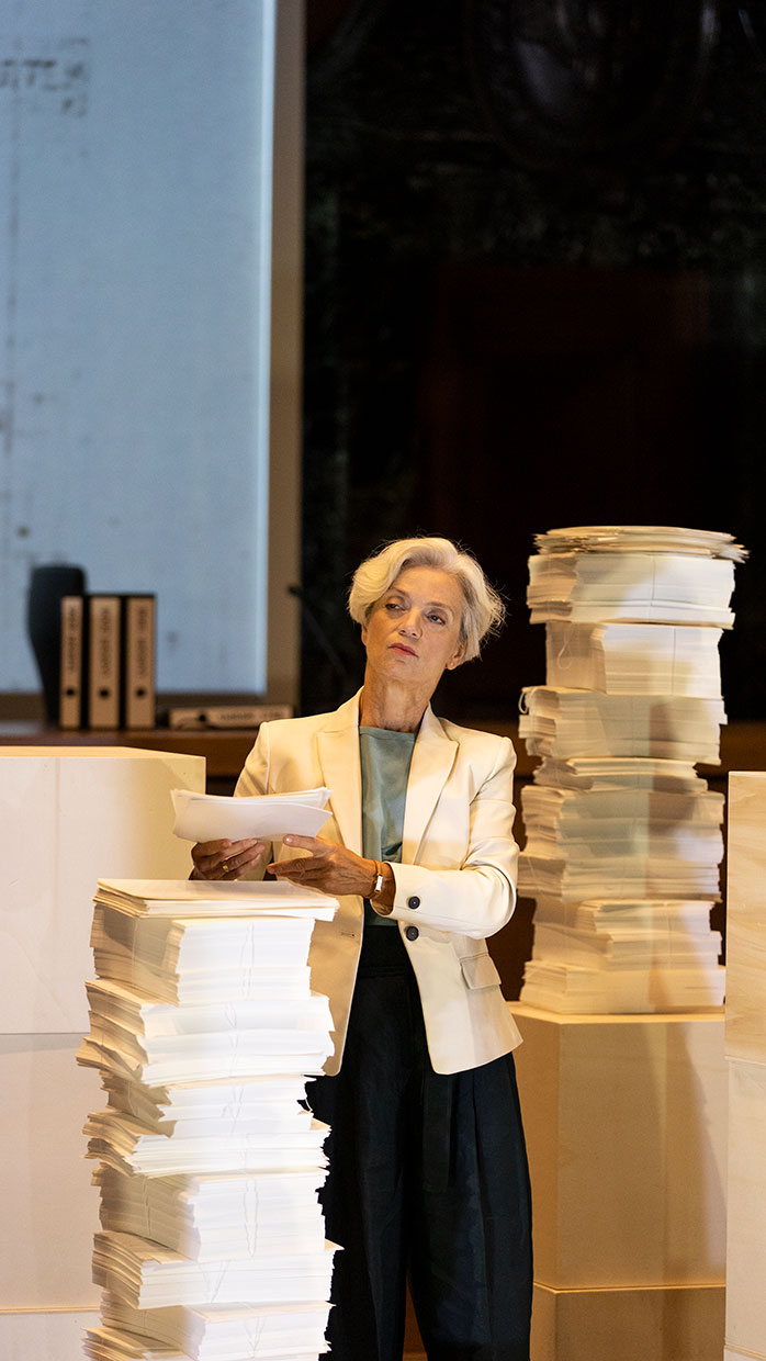 „Anna Klimovitskaya, Stephanie Leue, Adeline Schebesch, Nicolas Frederick Djuren und Janning Kahnert brauchen 25 Holzwürfel, Aktenordner und viele Blätter Papier, mehr nicht, um den Prozess selbst vorstellbar, den Weg ihrer eigenen Aneignung des Themas plastisch werden zu lassen. Es geht nicht darum, Göring zu spielen; es geht darum, was Göring im Prozess sagte. (…) Man sieht (u.a.) die KZ-Überlebende Marie-Claude Vaillant-Couturier bei ihrer Aussage; die Stimme leiht ihr Klimovitskaya, ein erschütternd beklemmender Moment.“